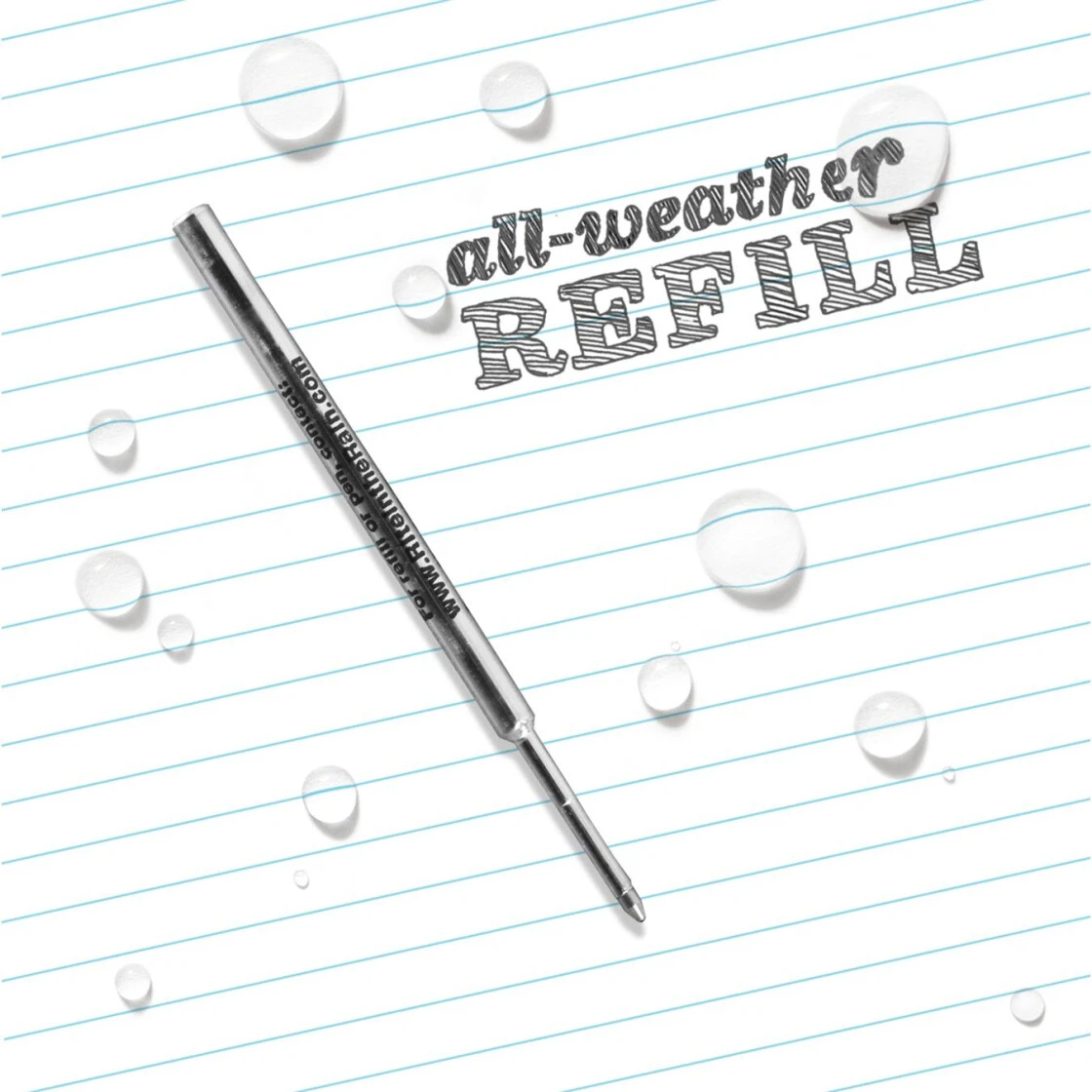 Der Kugelschreiber für die dauerhafte Notiz. Der All-Weather Pen schreibt auf nassem Papier sowie natürlich auf trockenem. Die Drucktintenpatrone arbeitet bei Temperaturen von -35 ° C bis 120 ° C. Die Tinte kann weder auslaufen noch verdampfen. Kopfüber funktioniert der Stift ebenfalls.