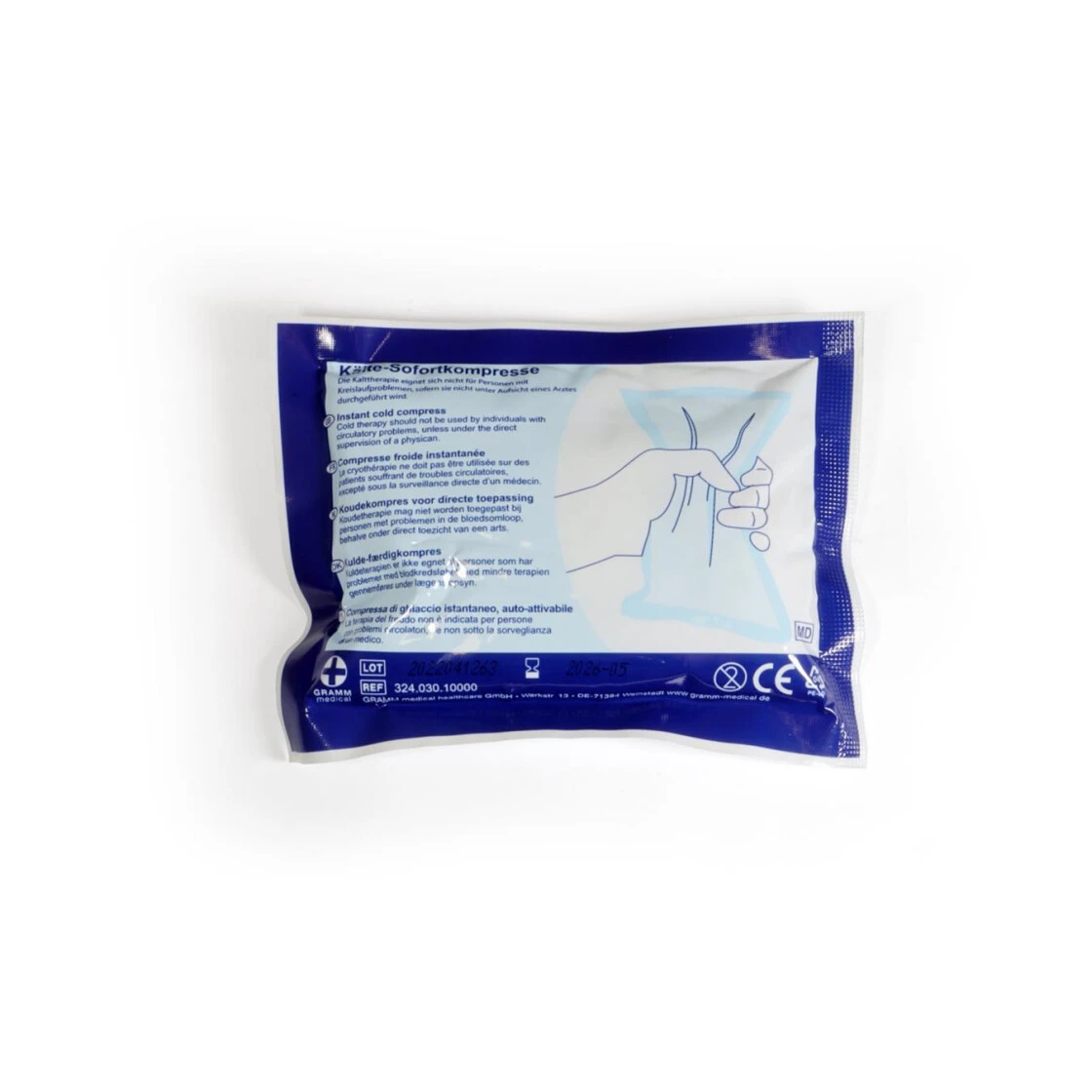 Sofort wirkendes Kühlmittel für Notfälle und Erste Hilfe. Eine schnelle und effektive Möglichkeit Schwellungen, Stiche, etc. zu behandeln. Es wird keine Vorkühlung benötigt! Der Beutel wird einmal kräftig gedrückt, geschüttelt und schon steht wohltuende Kühle zur Verfügung. Bis zu -8 °C und für ca. 20 Minuten. Einwegartikel. Nicht unter 0 °C oder über 45 °C lagern. Von Kindern fernhalten. Nicht bei offenen Wunden anwenden. Kann nach der Nutzung im Hausmüll entsorgt werden.