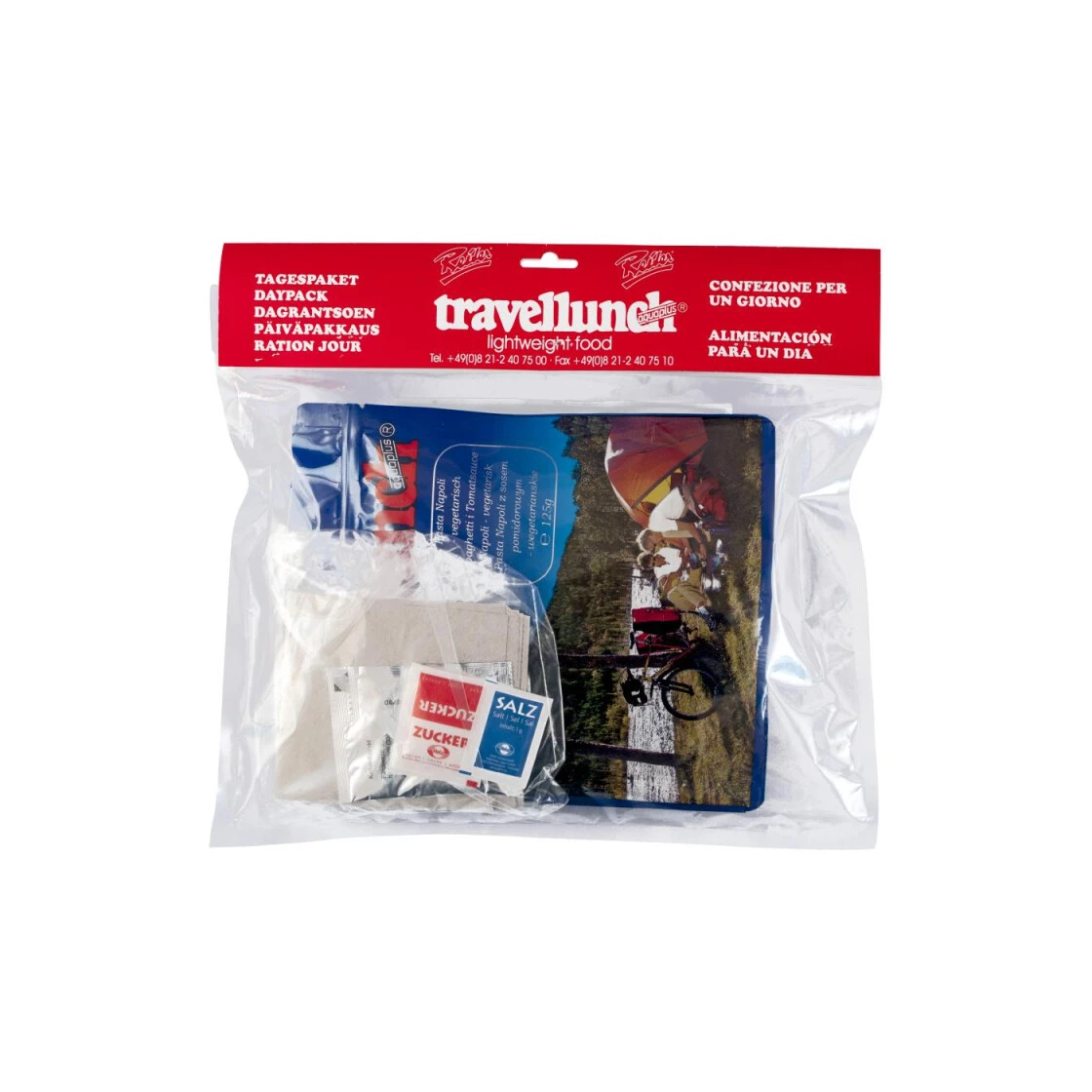 - Zusatzpaket mit Salz (1 g), Kaffeeextrakt (3,5 g für ca. 300 ml), Zucker (2 Briefchen) und Toilettenpapaier