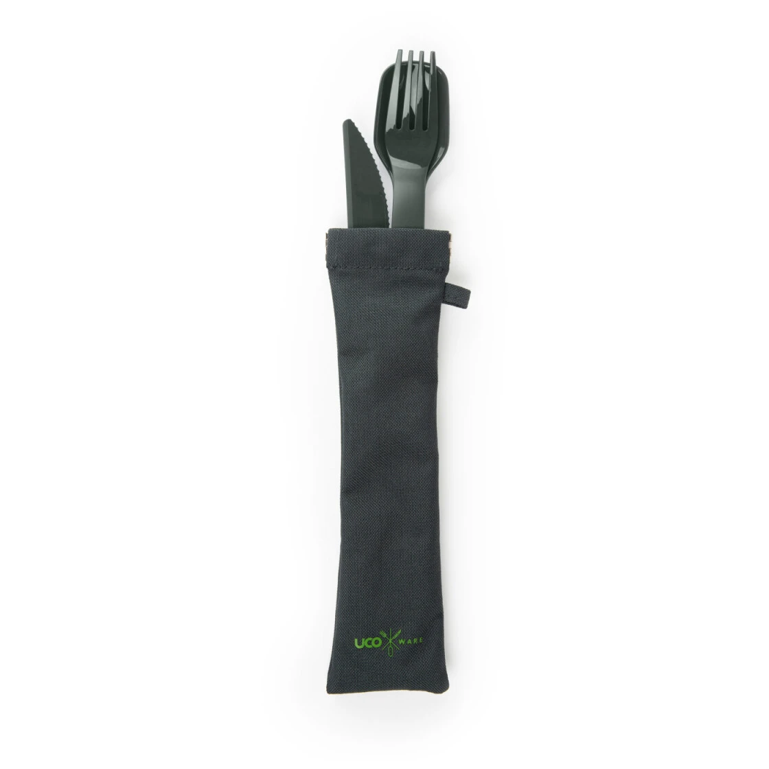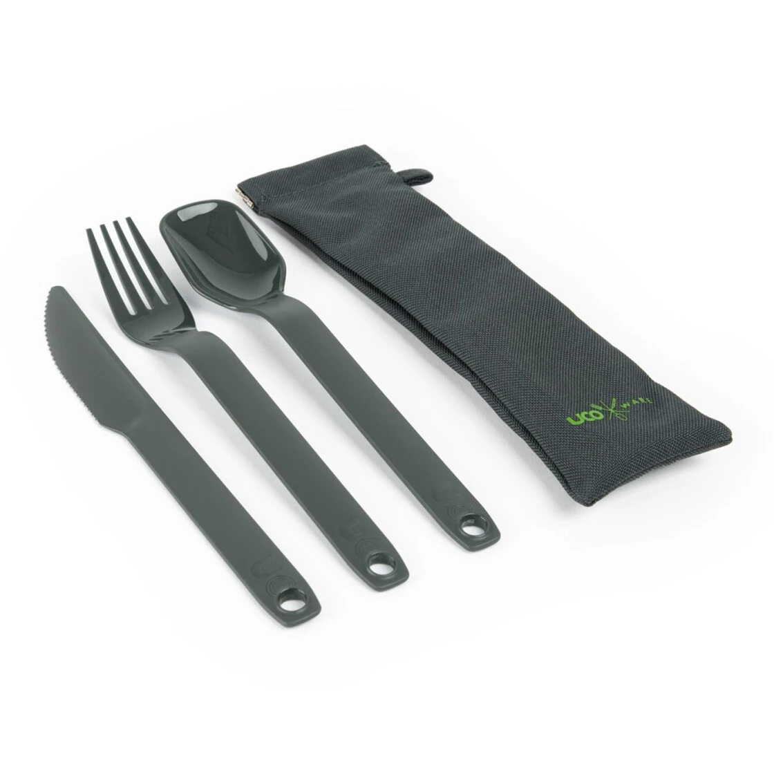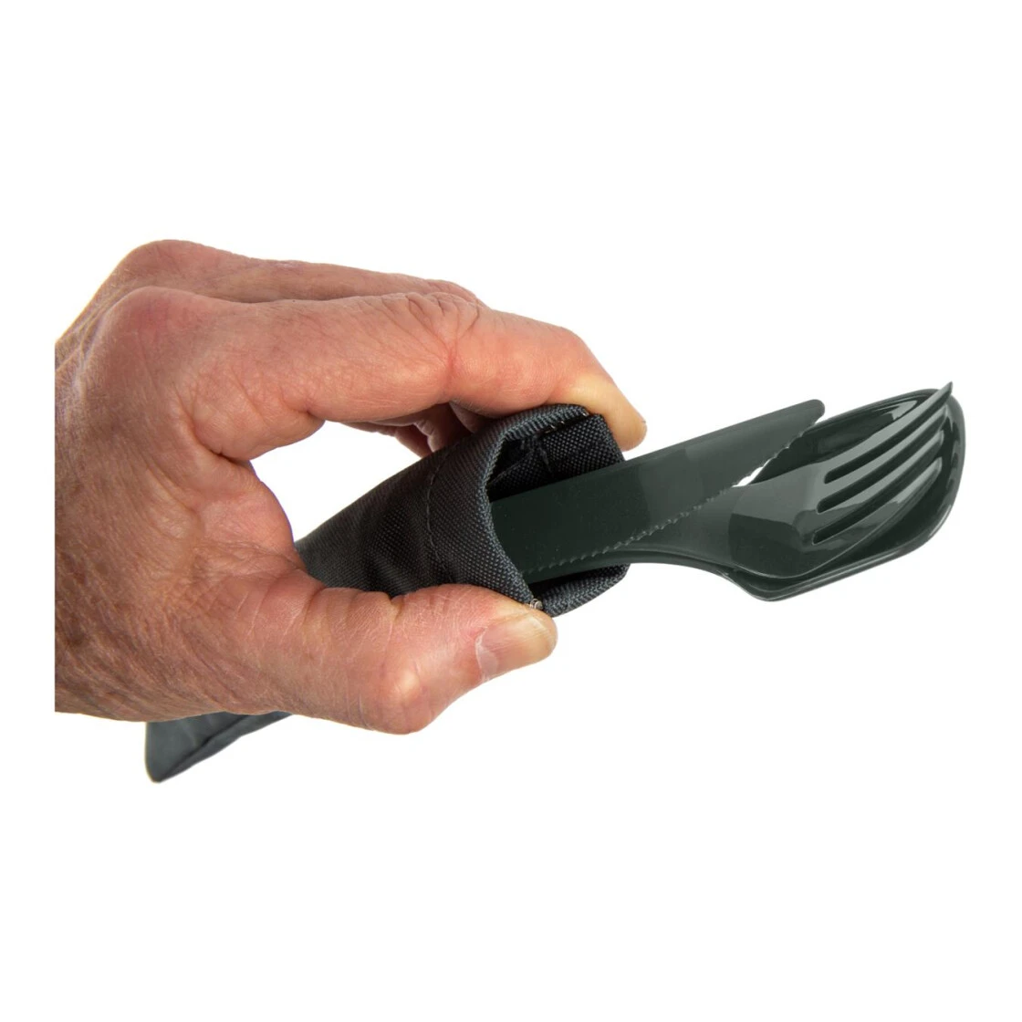 Ein praktisches Besteckset (Messer, Gabel, Löffel) im schönen Polyester Etui. Ein Loch dient zur Befestigung des Besteckset am Rucksack oder an der Tasche. Das Set ist spülmaschinefest und aus 100 % recyceltem Kunststoff hergestellt.