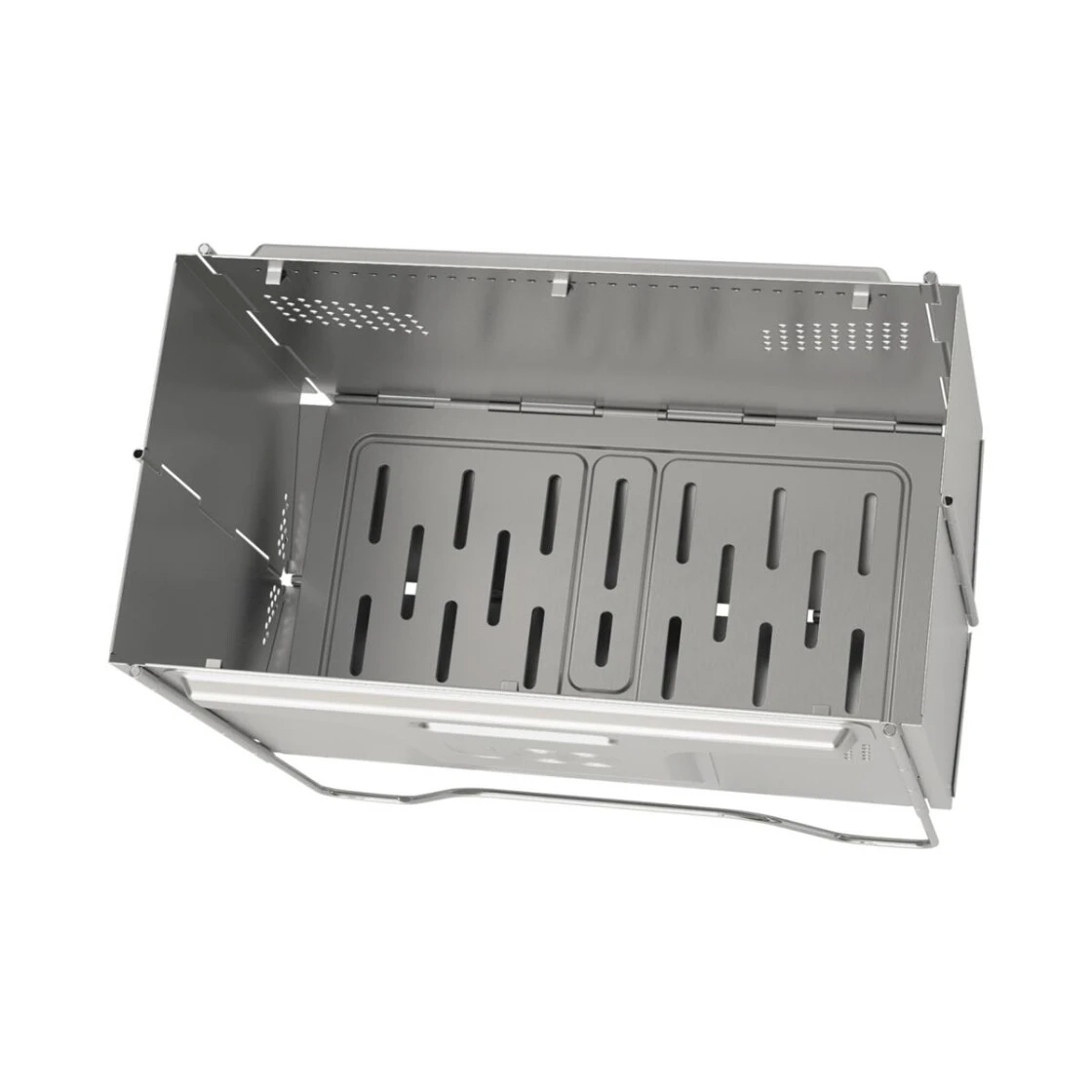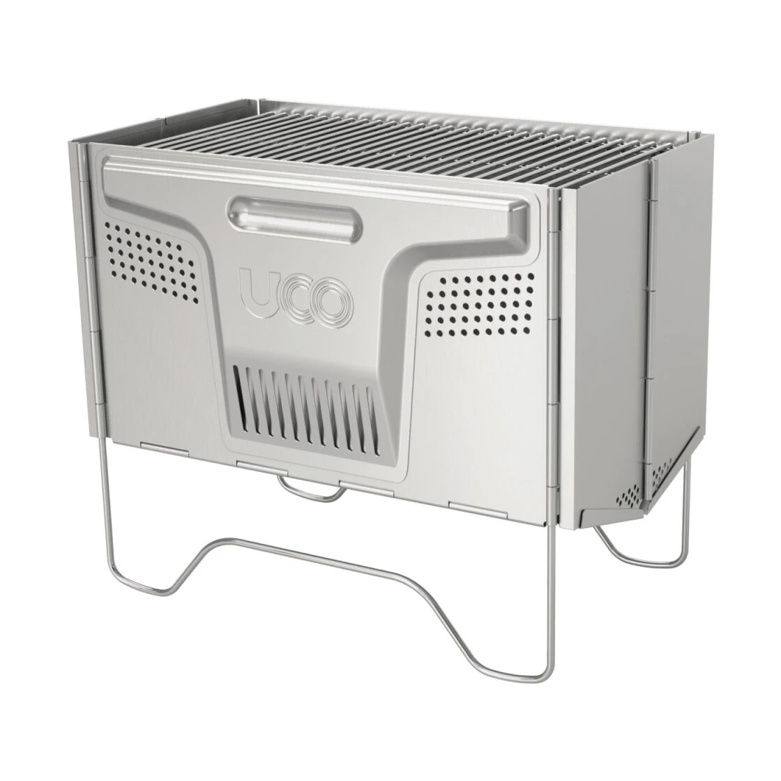 Kompakter und schnell auf- und abzubauender Grill aus Edelstahl, verpackt in einer praktischen Tragetasche. Lässt sich sehr flach falten und ist bestens geeignet für Familien und Gruppen für ein Lagerfeuer oder Grill Erlebnis. Der Grill bietet eine gute Belüftung und sorgt so für eine raucharme Feuerstelle.