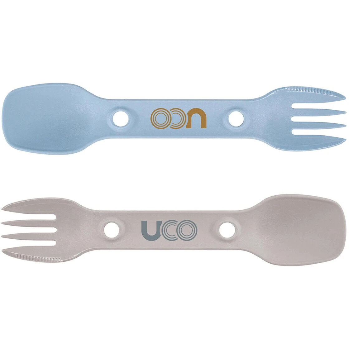 Der Spork ist kombinierbar als Löffel, Gabel und mit Mikrozacken zum Schneiden. Die zwei Löcher im Spork dienen zur Befestigung am Rucksack oder an der Tasche. Der Spork ist spülmaschinefest und mit Befestigungsschlaufe.