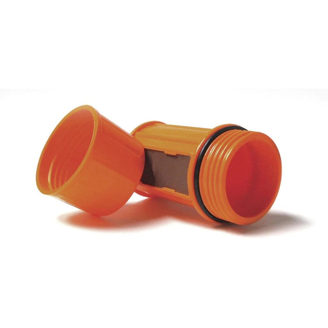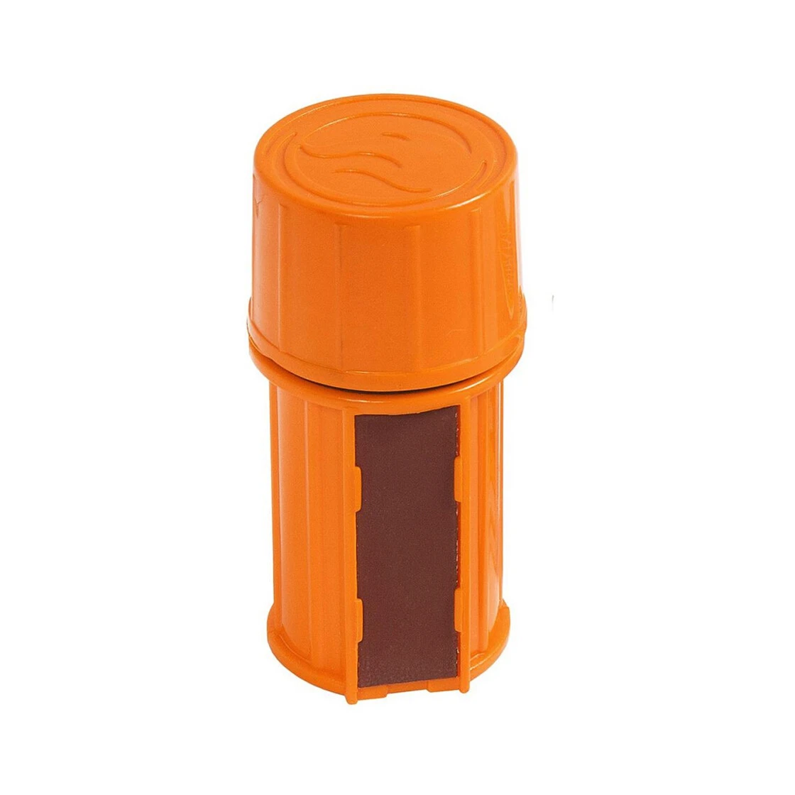 Etwas größere, wasserdichte Aufbewahrungsbox für Streichhölzer. An der Außenseite mit Reibfläche ausgestattet (2 weitere als Ersatz liegen bei). Mit Dichtung. Achtung: In der Dose sollten zusammen mit offenen Zündhölzern keine Reibflächen mitgeführt werden – Brandgefahr! Lieferung OHNE Zündhölzer!