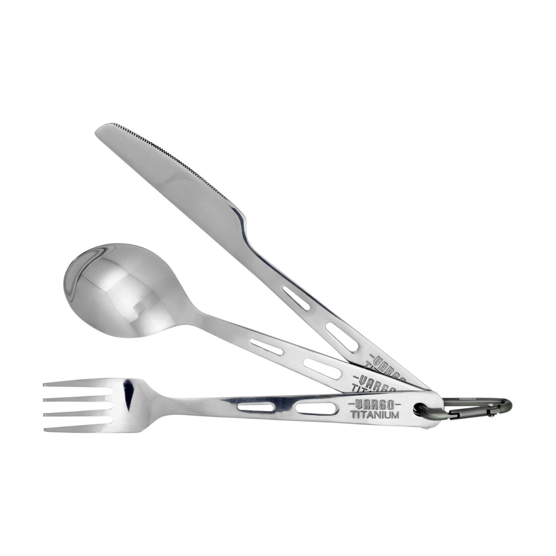 Das leichte 3-teilige Titanbesteck mit Karabiner-Clip zum Befestigen z.B. an Taschen, Rucksäcke, usw..
